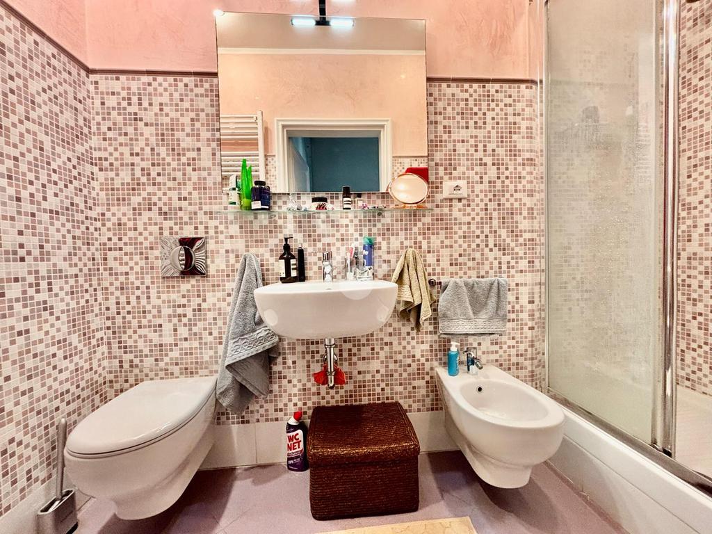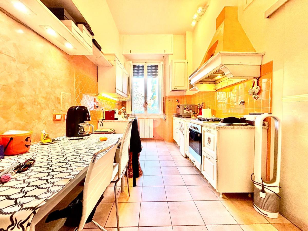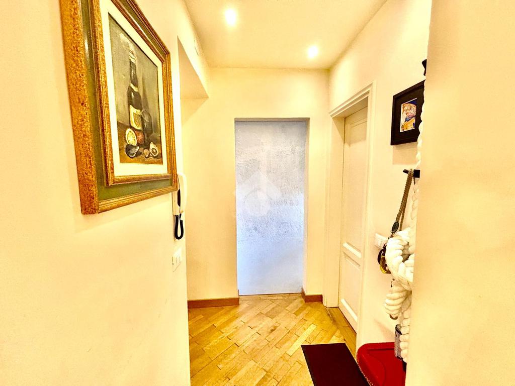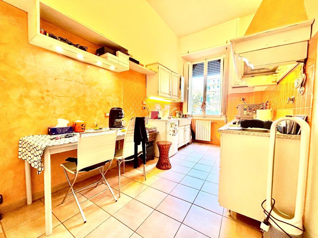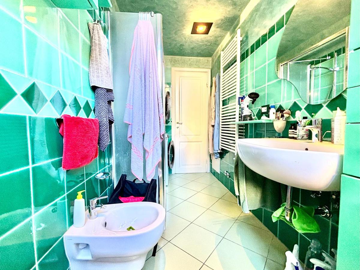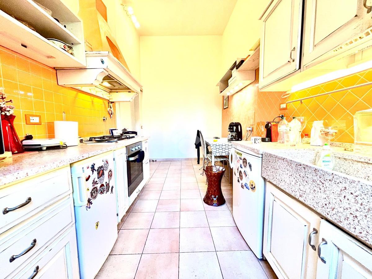 L'appartamento si compone da un ingresso aperto sull'ampia sala, caratterizzata da due punti luce e dotata di armadio a muro. La cucina è abitabile. Le due camere affacciano entrambe sui giardini tergali, garantendo degli affacci gradevoli e silenziosi. I bagni sono due, entrambi completi. Due palchi morti, un ripostiglio ed una cantina/sottoscala posta al piano seminterrato del palazzo completano la proprietà.