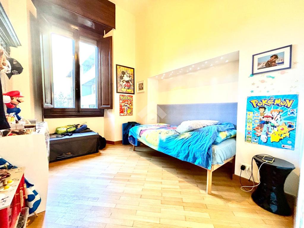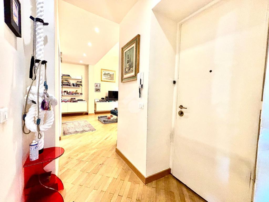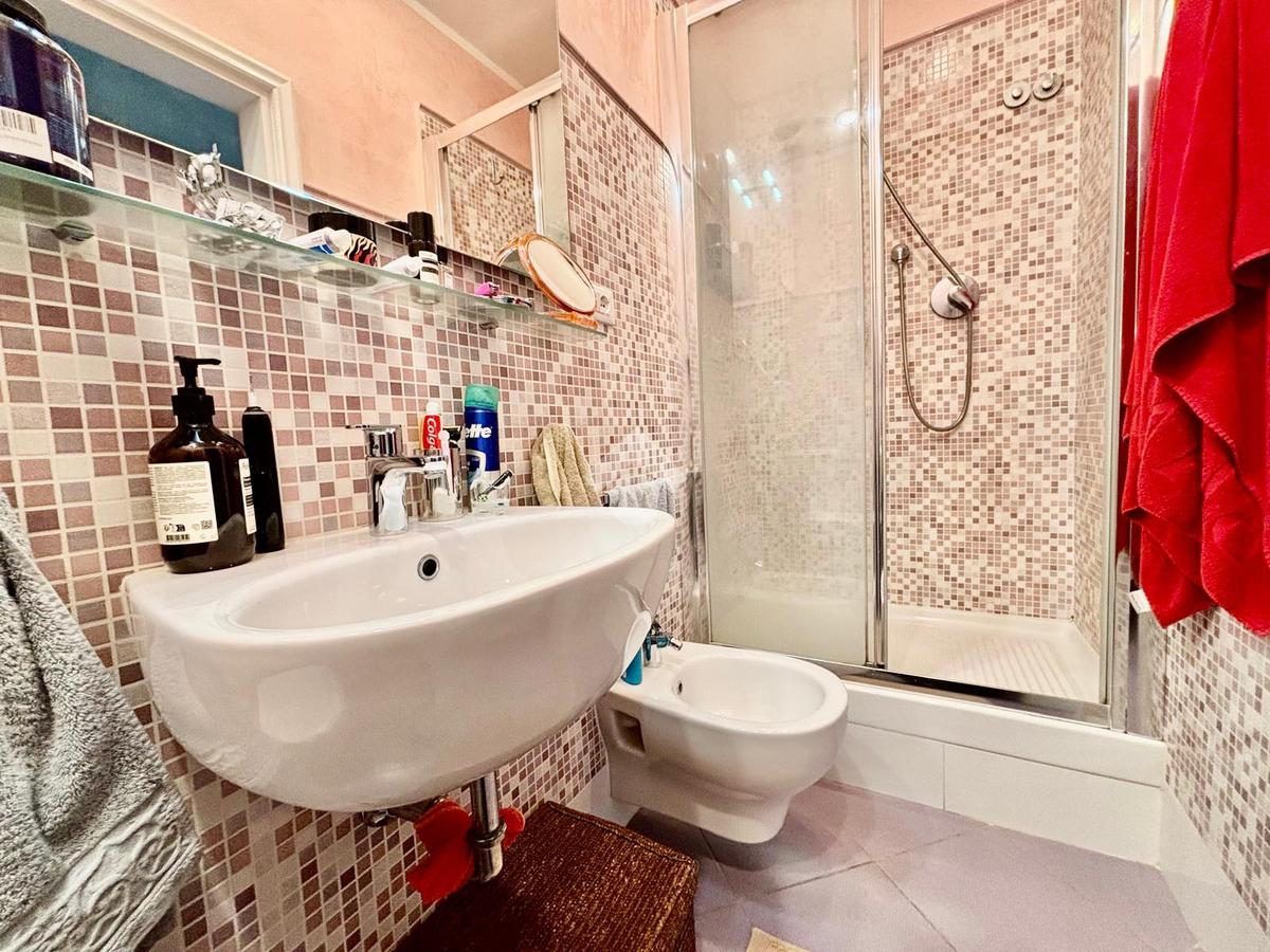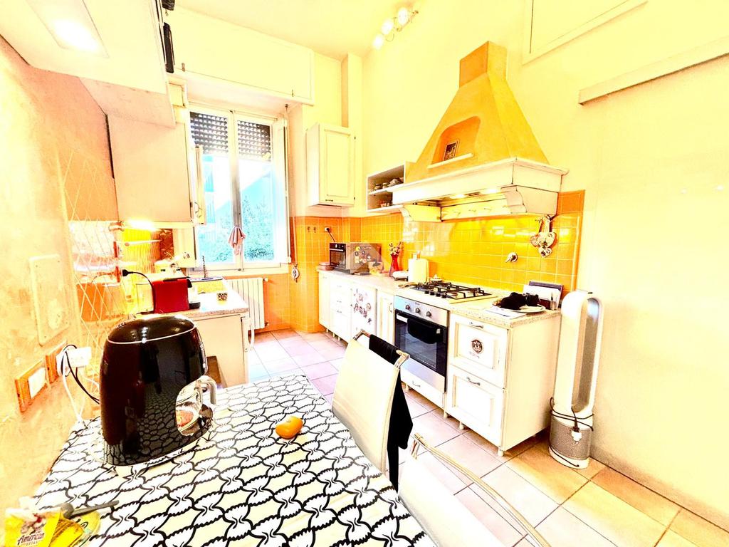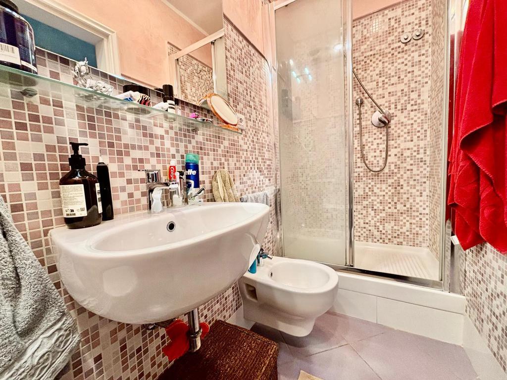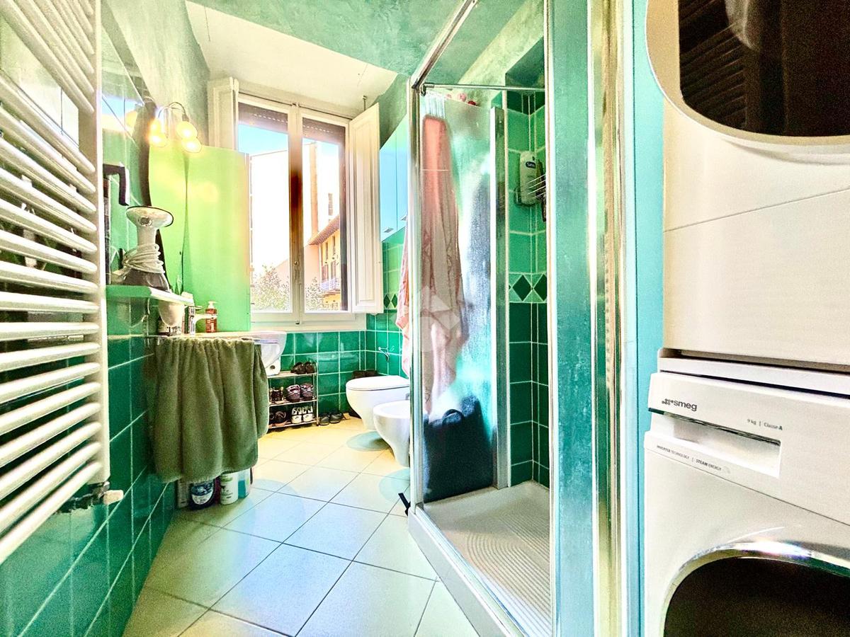L'appartamento si compone da un ingresso aperto sull'ampia sala, caratterizzata da due punti luce e dotata di armadio a muro. La cucina è abitabile. Le due camere affacciano entrambe sui giardini tergali, garantendo degli affacci gradevoli e silenziosi. I bagni sono due, entrambi completi. Due palchi morti, un ripostiglio ed una cantina/sottoscala posta al piano seminterrato del palazzo completano la proprietà.
