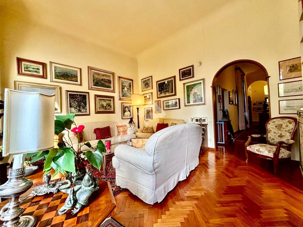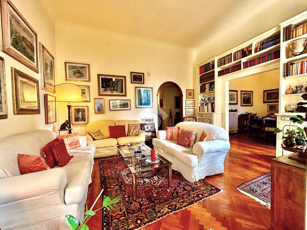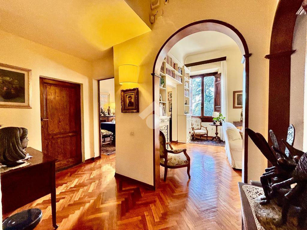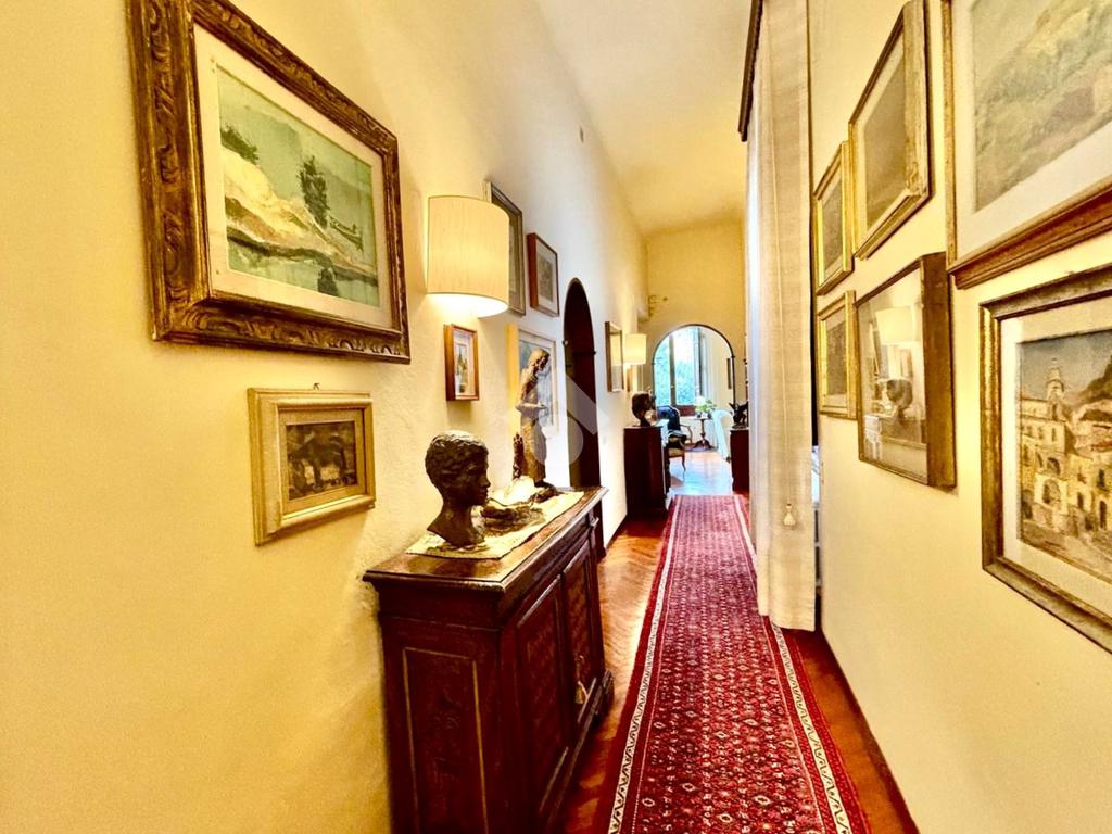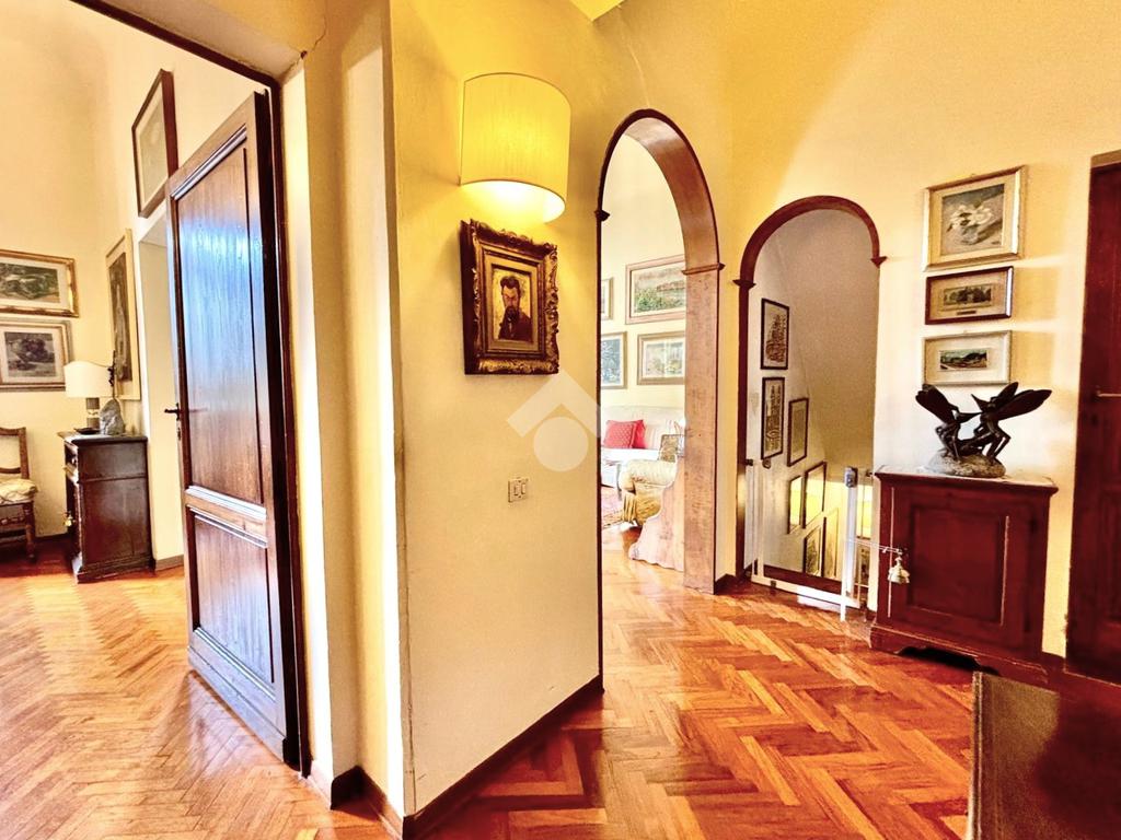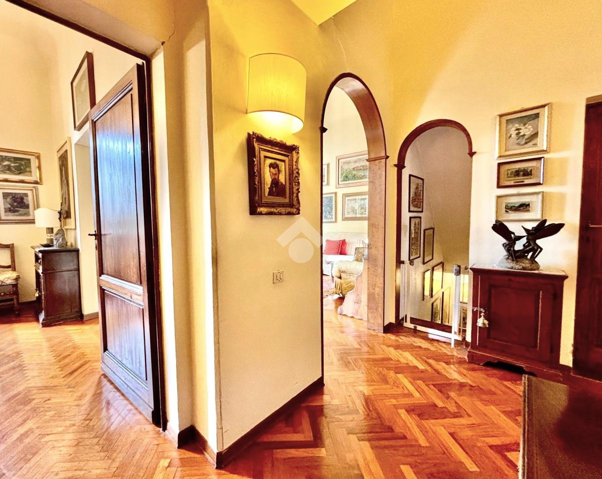 L'immobile si presenta con un ingresso, cucina, sala da pranzo, soggiorno doppio caratterizzato da ampie finestre. Le camere sono quattro di cui una con balcone, due bagni finestrati. Tramite una scala interna si accede a due stanze di servizio.