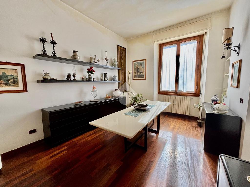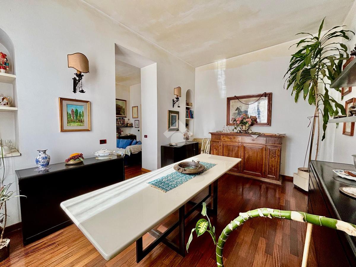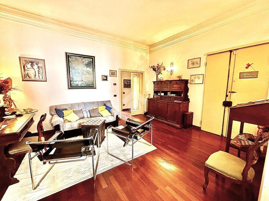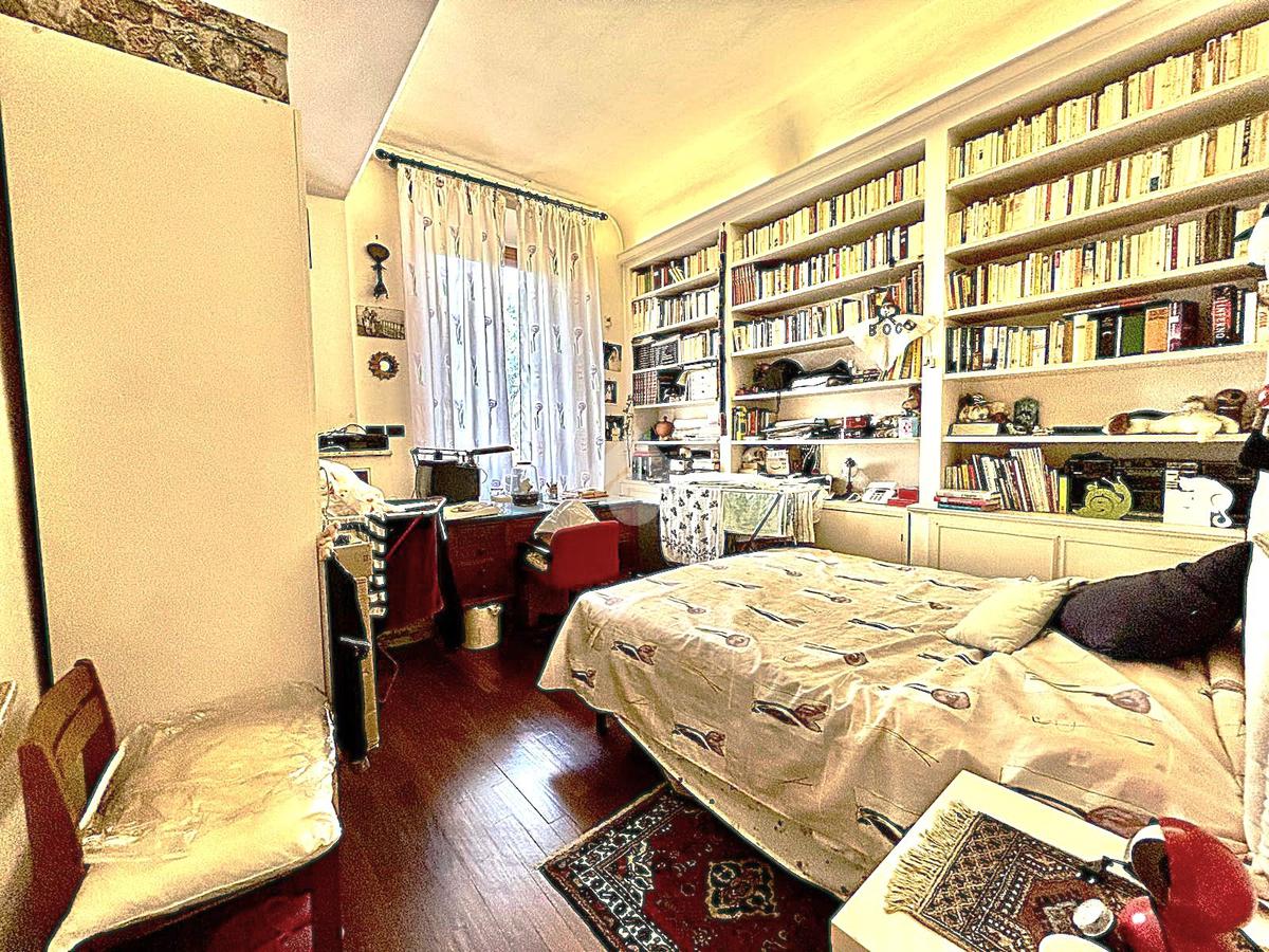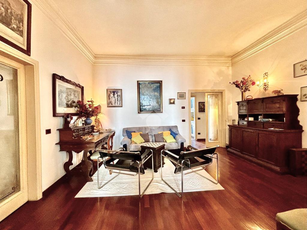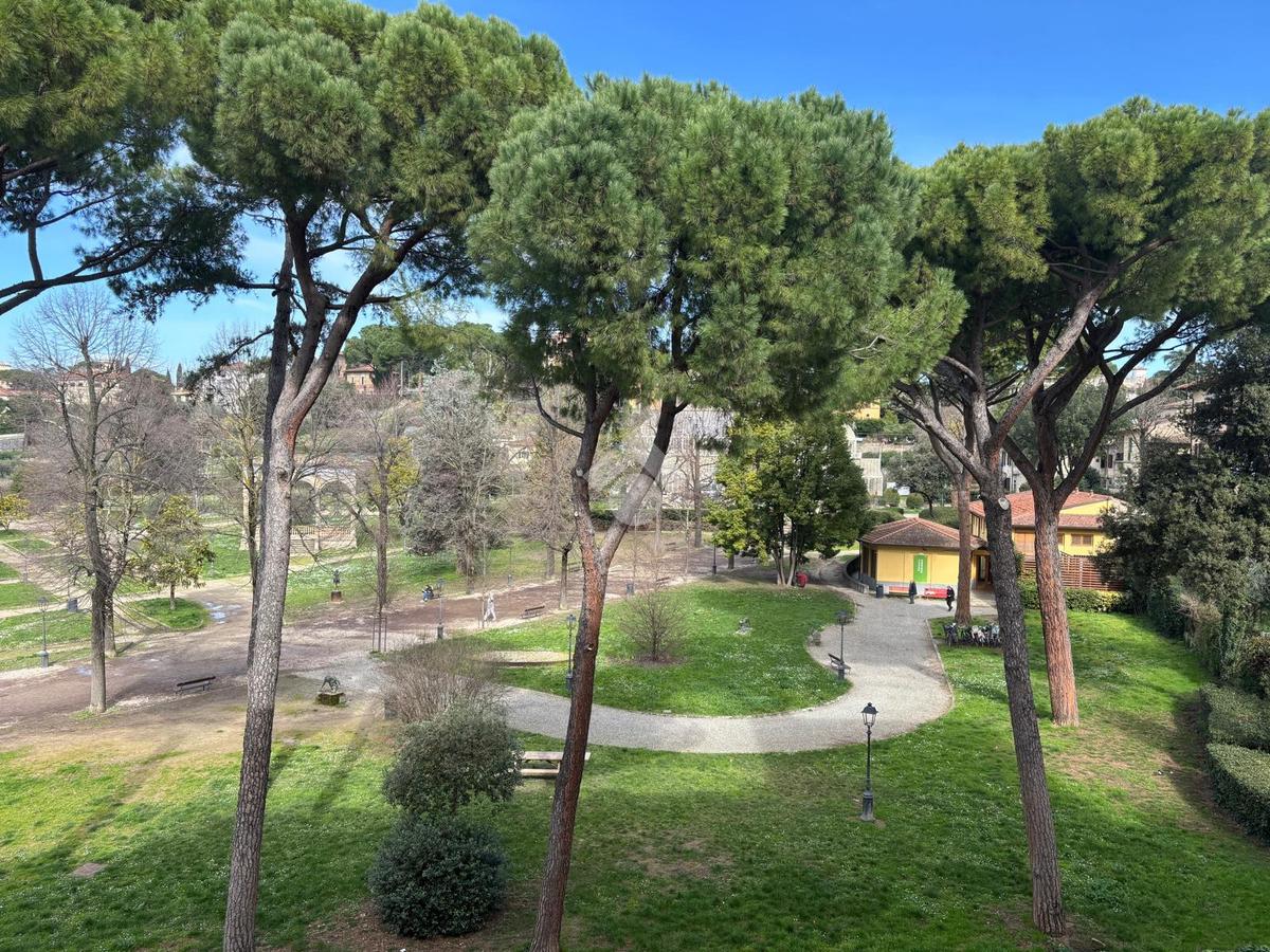 L'immobile si presenta con un ingresso arredabile che si apre sulla luminosa sala doppia che affaccia sulla via. La cucina è dotata di ampio balcone tergale sul giardino dell'orticoltura. Le camere sono tre, tutte matrimoniali. Ulteriore camera singola/studio. Tripli servizi e ripostiglio.